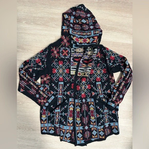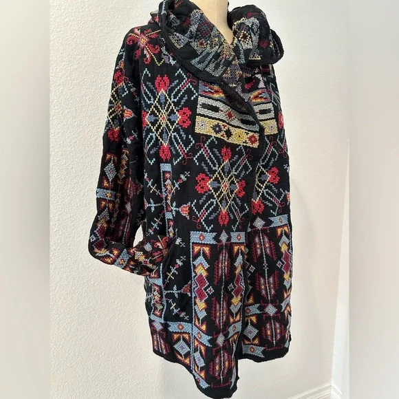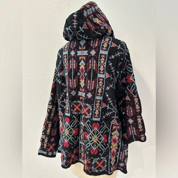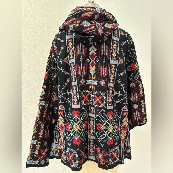 a colorful, intricately patterned hooded jacket. black background with vibrant embroidery in geometric designs, predominantly in red, blue, yellow, and white tones. The design has a distinct bohemian and folk-art vibe, featuring symmetrical patterns across the arms, torso, and hood. The jacket also has pockets, and a high-low hemline for added style. The intricate detailing and use of bold colors make it stand out as a statement piece, perfect for a bohemian or ethnic-inspired fashion collection.